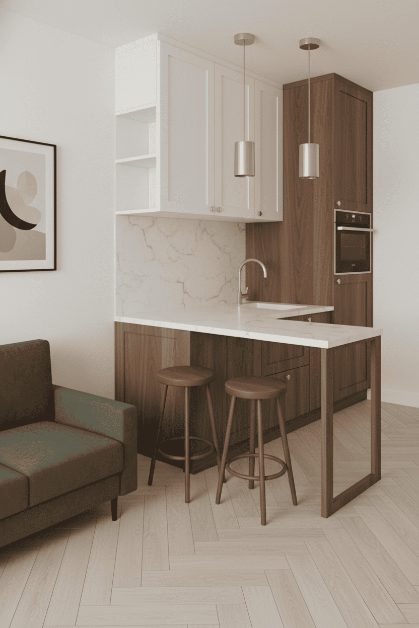 Strefa dzienna z otwartym salonem i aneksem kuchennym (15,24 m²), sypialnia (6,35 m²) oraz łazienka. Wszystko w zasięgu ręki.