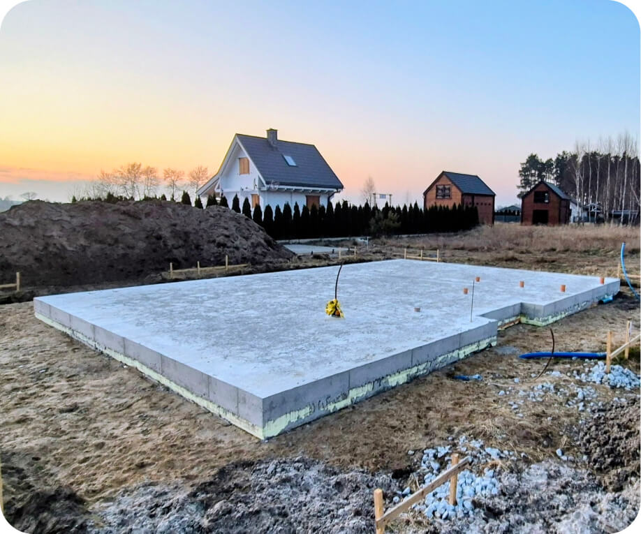 Zbrojona płyta fundamentowa ocieplona jest od spodu styropianem przeciwwilgociowym XPS o grubości 200 mm, każdy bok styropian XPS 80 mm, a pod wylewką dodatkowy styropian EPS o grubości 100 mm. To stabilna i ciepła podstawa budynku, w pełni przygotowana pod ogrzewanie podłogowe.