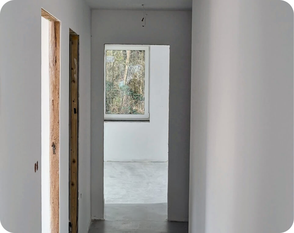 Płyty gipsowo-włóknowe lub gipsowo-kartonowe, starannie szpachlowane i malowane, w połączeniu z izolowaną pływającą wylewką cementową, zapewniają gładkie i równe powierzchnie ścian i sufitów.