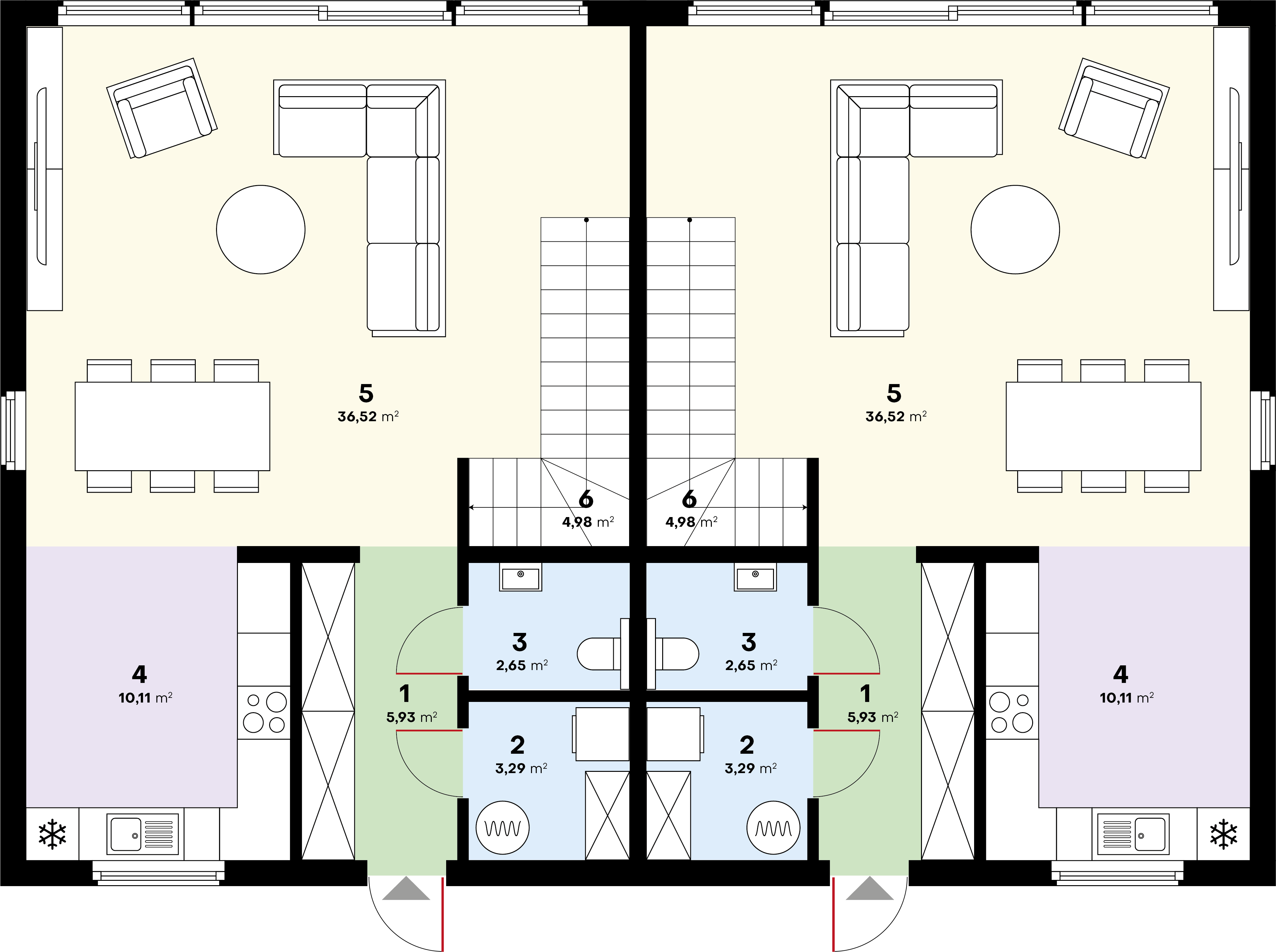 Piętrowy dom bliźniaczy, w którym każdy segment ma 115,65 m² powierzchni. Na parterze przestronny salon z kuchnią, toaleta dla gości i pomieszczenie techniczne. Na piętrze trzy sypialnie, w tym główna z garderobą i prywatną łazienką. Doskonały wybór dla rodzin, jak i inwestorów szukających pewnej i estetycznej zabudowy bliźniaczej.