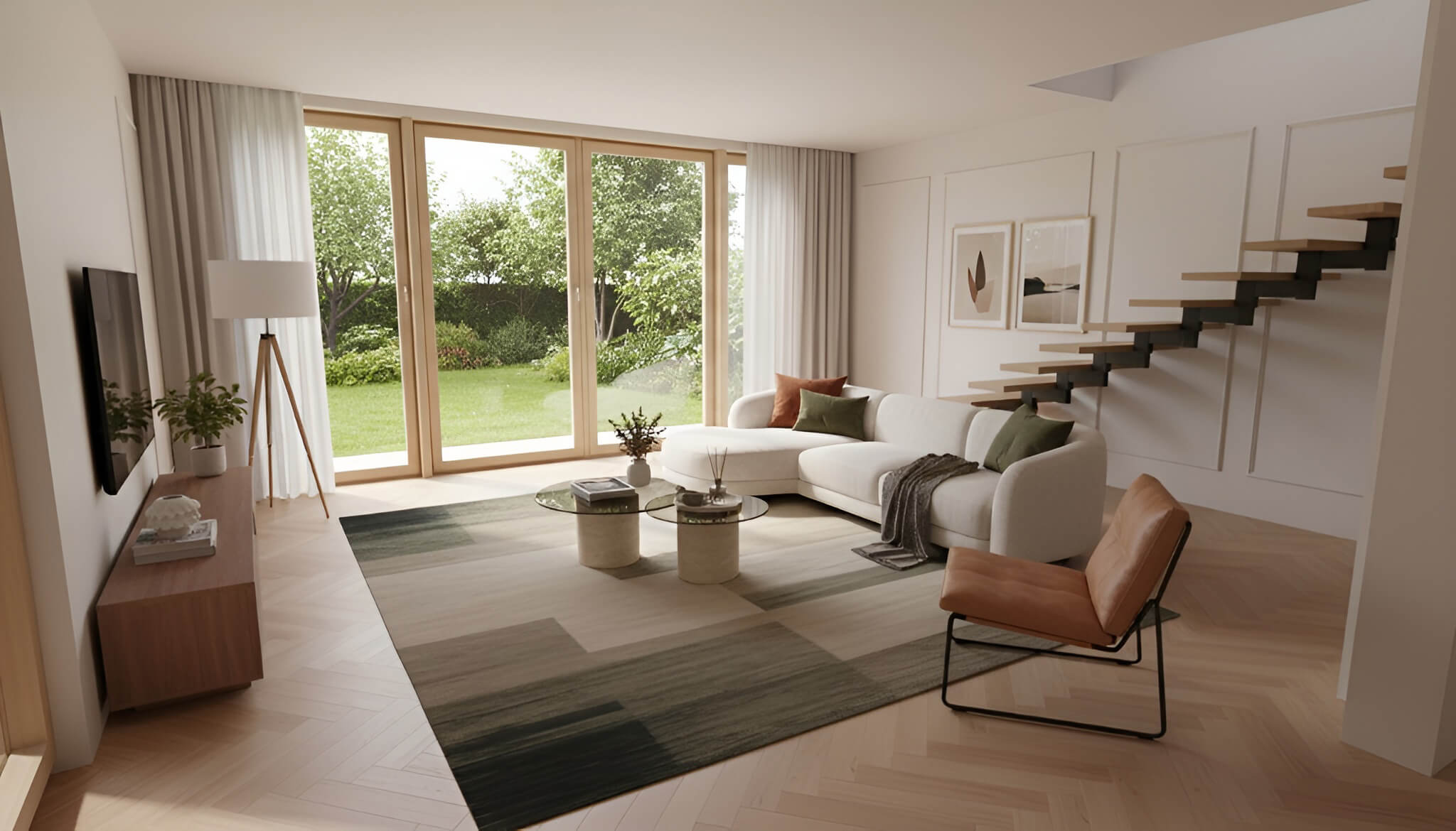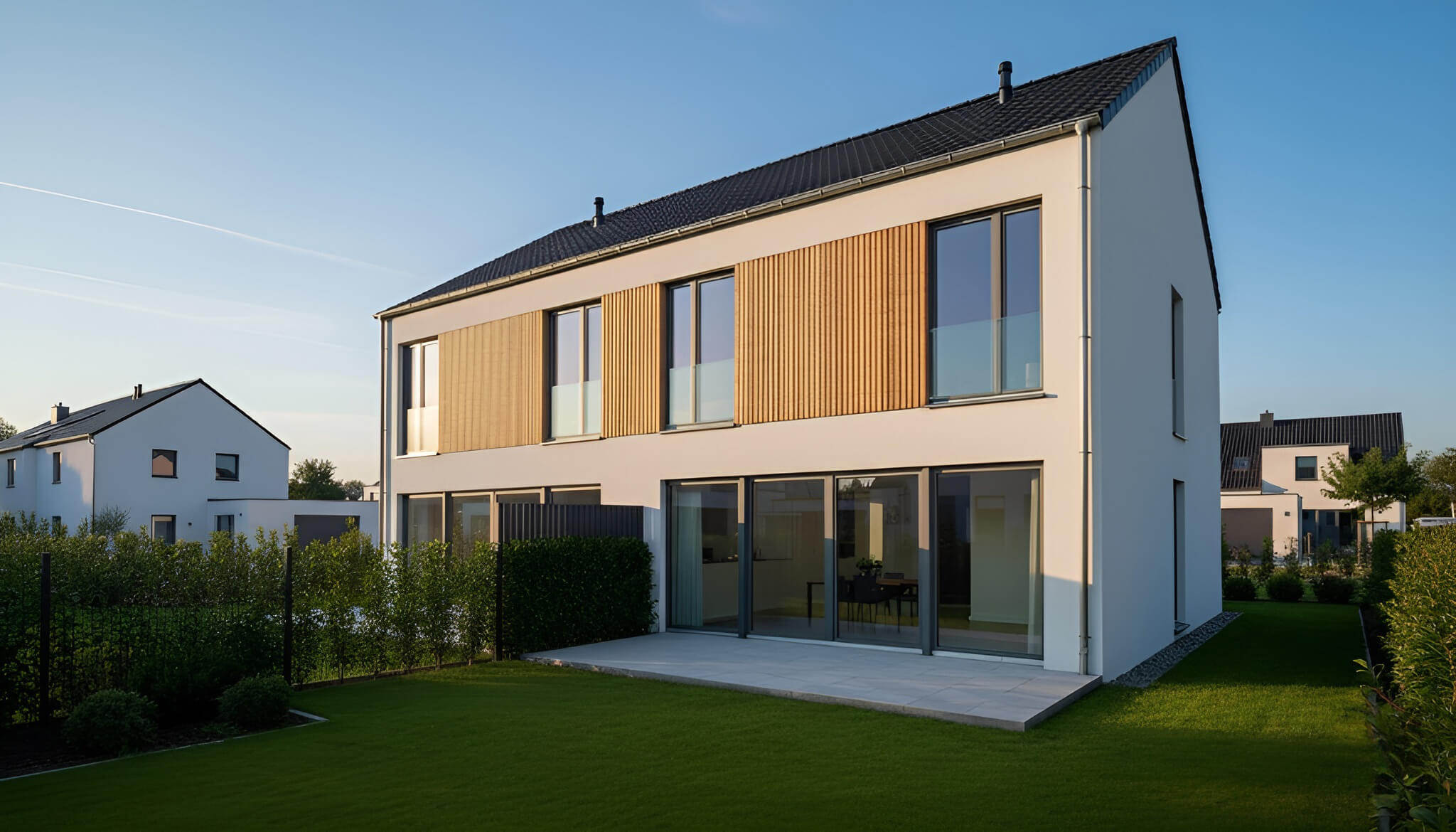 Combi, jak wszystkie nasze domy, został zaprojektowany w energooszczędnej technologii z wykorzystaniem naturalnych materiałów. Ściany o grubości 35 cm z drewna KVH, wypełnione izolacją drzewną, osiągają współczynnik przenikania ciepła U = 0,13 W/m²K – znacznie lepszy niż w tradycyjnych domach murowanych. To gwarantuje komfort cieplny przez cały rok oraz znacząco niższe rachunki za ogrzewanie.