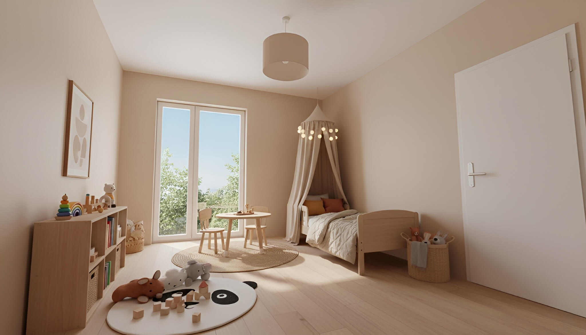 Na piętrze dom oferuje trzy sypialnie – w tym sypialnię główną o powierzchni 12,8 m² z prywatną garderobą i własną łazienką. To komfortowa strefa rodziców, z miejscem na łóżko typu queen-size i szafki nocne. Dwie dodatkowe sypialnie (ok. 11,5 i 10 m²) sprawdzą się idealnie jako pokoje dziecięce, gabinet do pracy zdalnej lub pokoje gościnne. W centralnej części znajduje się druga łazienka (5,7 m²) z miejscem na wannę lub prysznic, 2 umywalki i pralkę z suszarką. Dodatkowe pomieszczenie gospodarcze (2,1 m²) może pełnić funkcję schowka na sezonowe rzeczy, walizki czy sprzęt domowy.