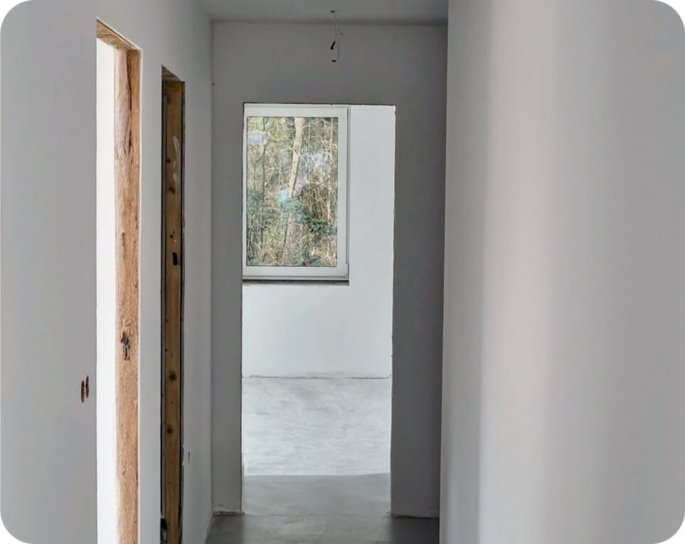 W standardzie deweloperskim wszystkie ściany i sufity wewnętrzne wykańczamy płytami gipsowo-włóknowymi lub gipsowo-kartonowymi, które są następnie szpachlowane i malowane na biało. Podłogi przygotowujemy pod finalne warstwy posadzkowe, wykonując pływającą wylewkę cementową o grubości 60 mm i izolacją styropianem EPS o grubości 100 mm.