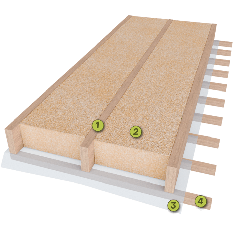 Przemyślana konstrukcja, która łączy doskonałe właściwości termoizolacyjne z wytrzymałością i szczelnością. 30-centymetrowa warstwa wełny drzewnej STEICOzell nie tylko chroni przed zimnem, ale także akumuluje ciepło i skutecznie izoluje od letniego upału. Wykonana z certyfikowanego drewna KVH, dzięki zastosowaniu paroizolacyjnej membrany STEICOmulti membra 5 daje pełną kontrolę nad przepływem wilgoci. Lekki ruszt pod płyty gipsowo-kartonowe, tworzy estetyczny i łatwy do aranżacji sufit.